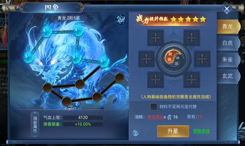 升级四象系统的关键在于源石,这些神奇的石头可以通过参与副本和活动等渠道获取。源石用于提升四象等级,每次升级都将带来显著的能力提升,增强玩家在战场上的实力。