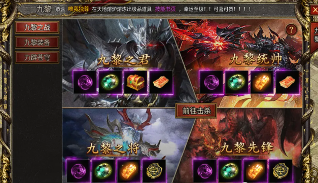 3.可通过击杀九黎BOSS掉落的九黎核心装备、九黎战装、九黎剑甲提升属性。