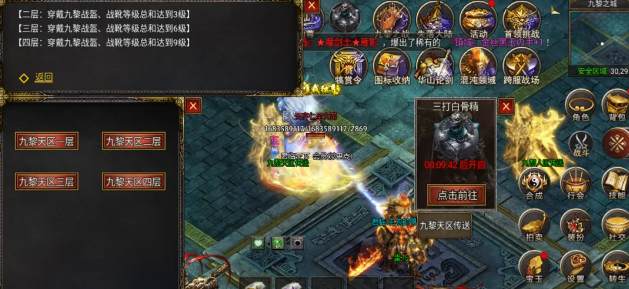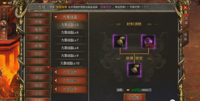 4、九黎战装包含九黎战盔和九黎战靴,其等级为进入更高层的必需条件,可通过击杀九黎BOSS掉落的九黎战装碎片合成和升级,建议合理规划两件九黎战装的升级顺序。