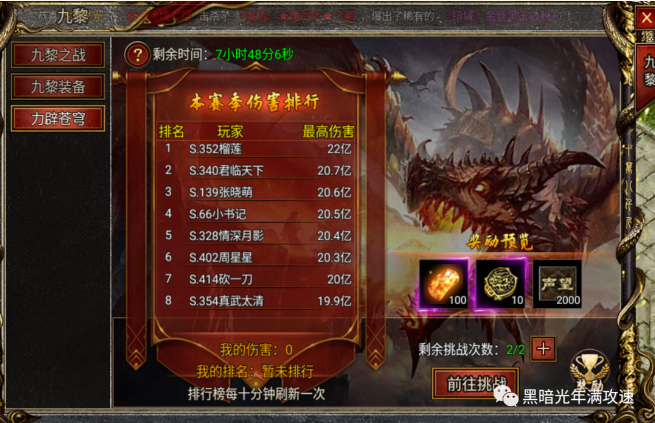 2、玩法开启期间每天6:00-22:00可进入副本挑战,玩家对BOSS造成伤害会统计到个人总伤害内,副本结束后会记录到排行榜上,排行榜只取当日的历史最高伤害