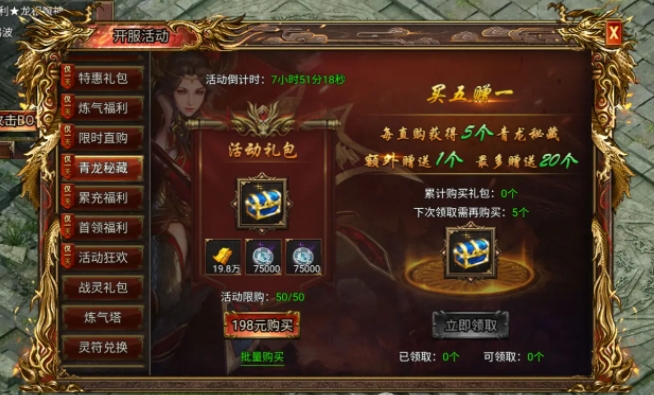 买五赠一福利:玩家每直购获得5个青龙秘藏都可以额外赠送1个,最多赠送20个。