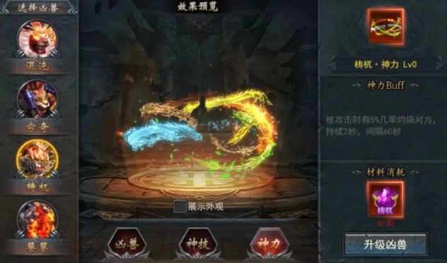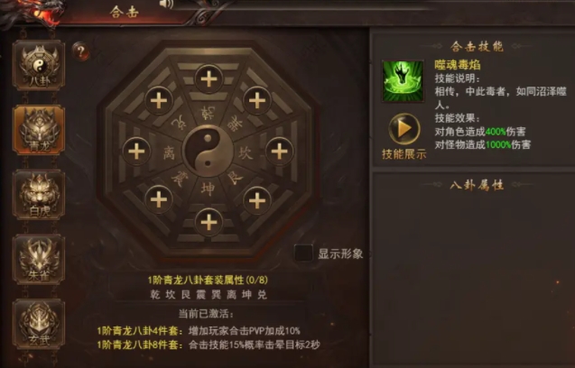 圣兽八卦系统为玩家提供了额外的增益效果,集齐同类型圣兽八卦的4件套或8件套时,即可激活对应的套装属性,为合击技能带来强大的增益效果。