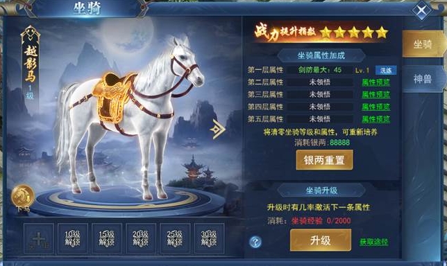 升级坐骑:使用坐骑经验可以升级坐骑。每次升级,所有已激活的坐骑属性等级会+1,并且有几率激活下一层属性。坐骑最高可达50级满级,越早激活高层数的属性,该属性的等级上限就越高。