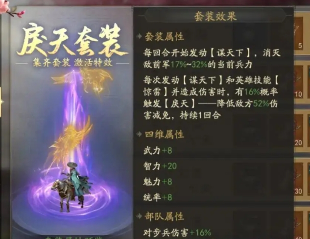 戾天套装的核心效果是【戾天】——降低敌方50%伤害减免。这一效果非常适合各类爆发高的文官,能够显著提升技能伤害和兵种伤害。
