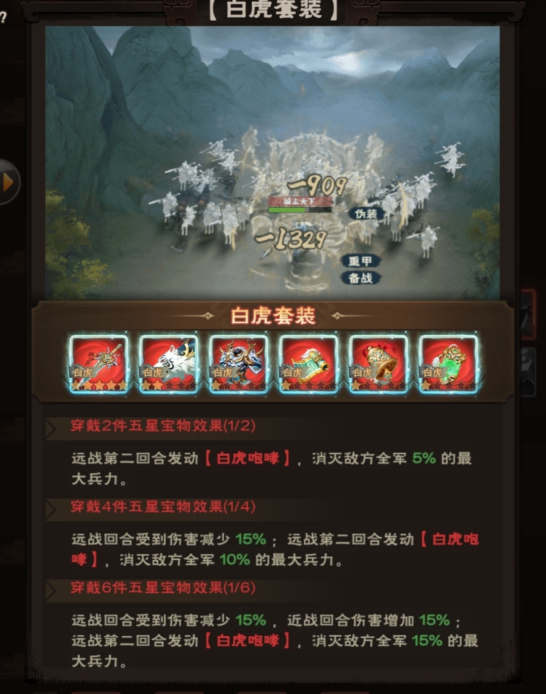 2件套:激活“白虎之威”效果,提升全体上阵武将5%的攻击力。