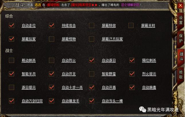 设置拉刺杀技巧的步骤很简单:首先点击 “设置” 图标,进入 “设置战斗页面”;接着勾选 “移动刺杀” 和 “隔位刺杀” 选项,同时关闭自动烈火技能。之所以要关闭自动烈火技能,是因为烈火技能与刺杀技能相互冲突,同时开启无法实现边走边 A 的攻击技巧。