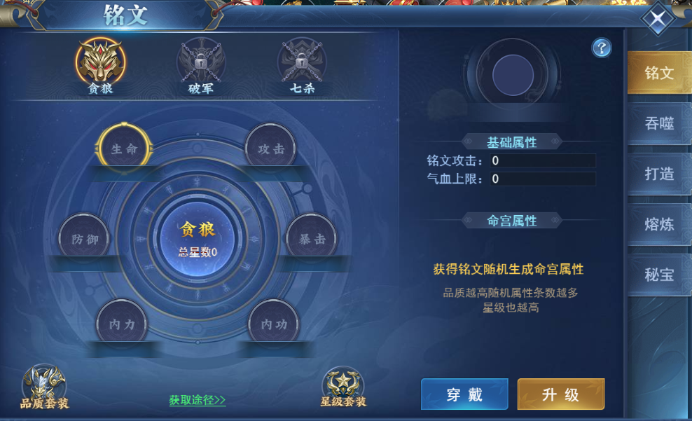 穿戴全套指定品质的铭文可以激活品质套装属性。同时,穿戴满足对应铭文星级的铭文可以激活星级套装属性。
