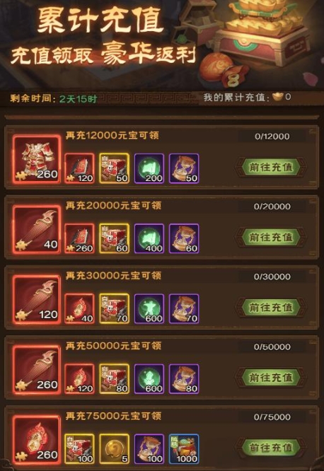 新区开区17-21天:在新区开区的17-21天内,玩家可以通过累积充值元宝获得火神套装。累积充值75000元宝可以获得5件火神套装及全部材料,但需要注意的是,武器需要单独购买。