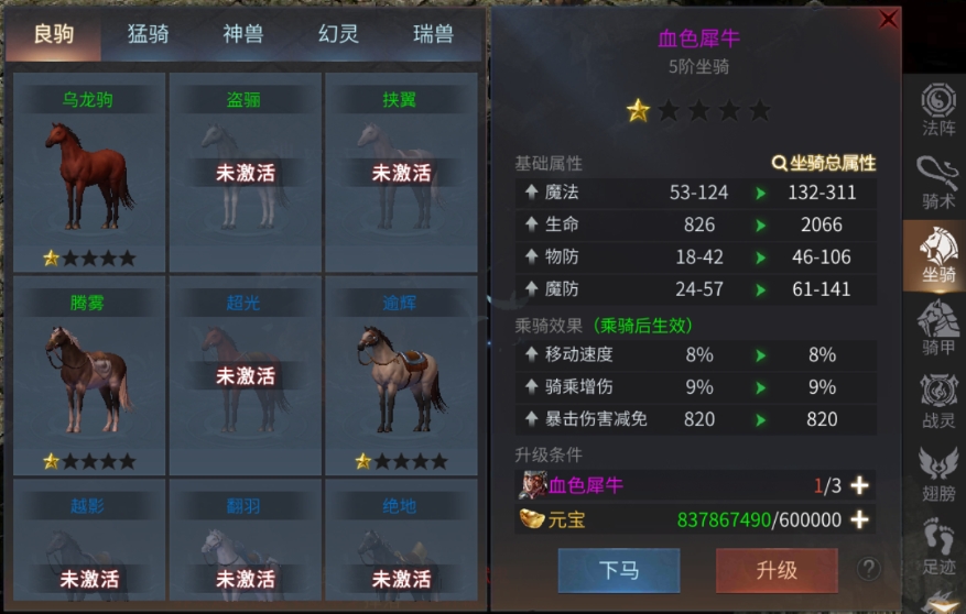 坐骑进阶丹可以用于提升坐骑的阶级,阶级越高,提升的战力越高,移动速度也越快。此外,高级坐骑还会有炫酷的外观形象。