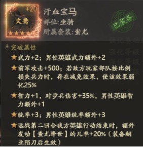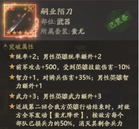 刘备、曹操、孙策、张辽:即使只搭配蚩尤套的前两件装备(嗣业陌刀和汗血宝马),也能解锁第一条破防属性。在近战第二回合,我方英雄行动结束时,对敌方全军发动蚩尤降世,按敌方每个已损失兵力的50%,消灭其剩余兵力。这一效果在实战中极为珍贵。