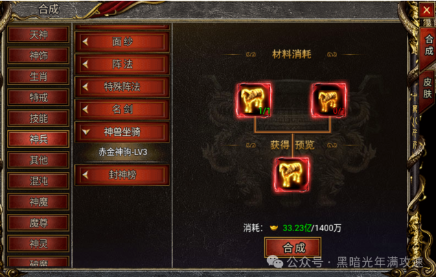 大家要想获得神兽坐骑,可通过一些运营活动,有机会获得LV1级的坐骑神兽。我们要想获得其他高级的坐骑神兽,就要通过合成系统,将两个完全相同的坐骑神兽,合成更高一级的坐骑神兽,合成需要消耗大量的元宝,合成成功几率为百分百成功。