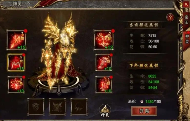 升阶:使用神灵精魄可以提升神灵装备的阶数,增加属性加成。