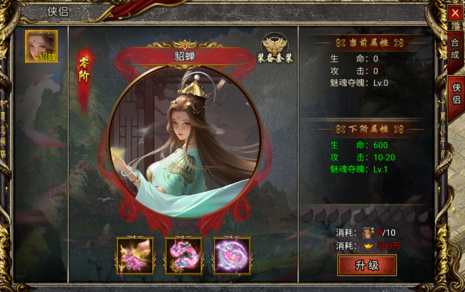 侠侣貂蝉即可使用貂蝉信物提升人物属性并获得【魅魂】效果,魅魂:攻击时有几率魅惑敌方,2秒内无法攻击、无法释放技能高等级貂蝉可抵抗低等级貂蝉的【魅魂】。貂蝉信物可以通过血火洗礼玩法、灵符商城和特殊活动中获取。