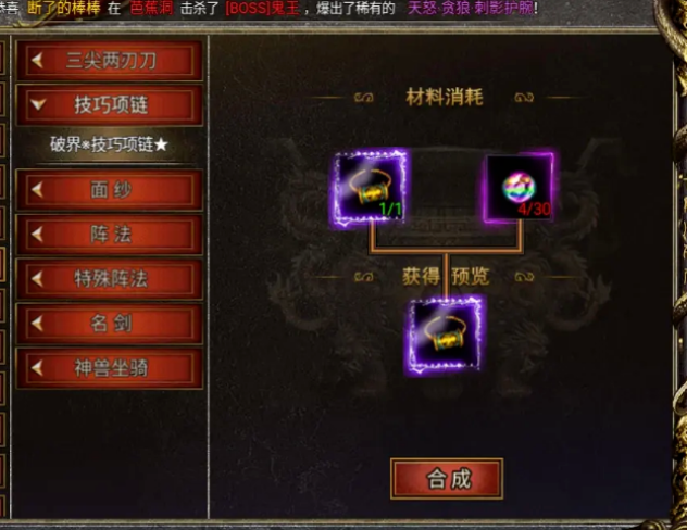 技巧项链的合成需要耗费20个【至尊宝石】和1个【万能合成石】,合成后可以获得更高属性效果的技巧项链。而且,技巧项链还可以通过合成来进行升级,提升更高的属性效果。