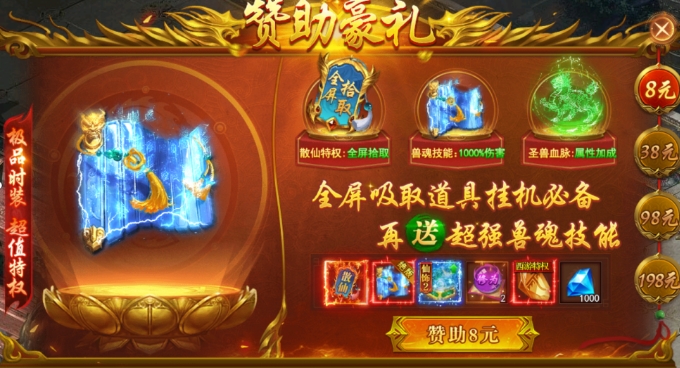 火尖枪:赞助后可获得火尖枪,提供攻速加成和真炎灭魔技能,BOSS见面即秒15%血量,大幅提升输出能力。