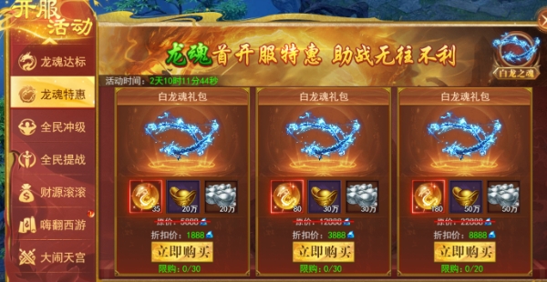 活动内容:龙魂达标活动,在线时间满足可领取白龙魂,提升龙魂等级有达标奖励,终极奖励是吸血神器悟空神棒。同时还有龙魂特惠活动,超级划算。