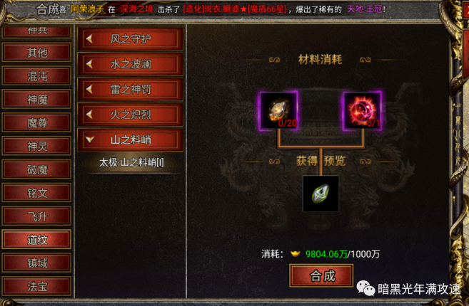 在白蛇传奇游戏中道纹中山纹是开服满足180天后才会开启的,可以使用山纹结晶和万能合成石在合成界面获得,山纹结晶可以通过失落宝库1:1兑换获得。