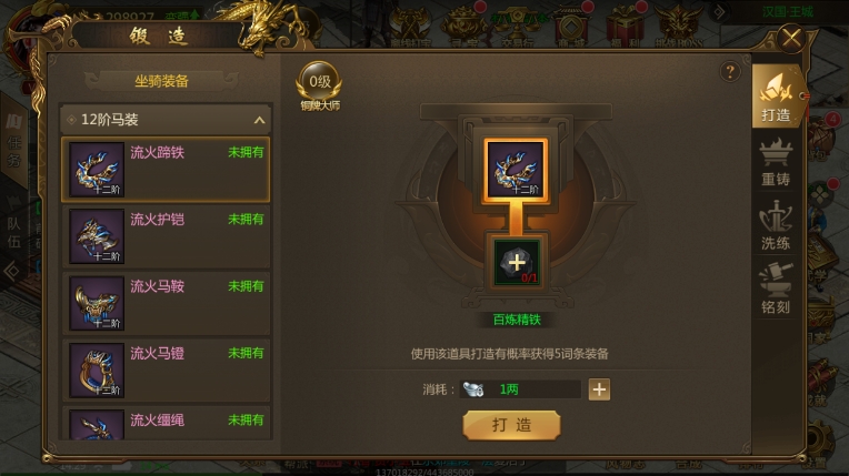 选择打造:在训马师处选择打造马匹装备,将材料放入打造槽中。
