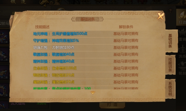 升级马匹装备所需的材料与打造材料基本相同,但不再需要马装碎片。从龙骧马装备开始,每次升级还需要添加封魔葫芦、至尊符印、乾坤图谱等道具。