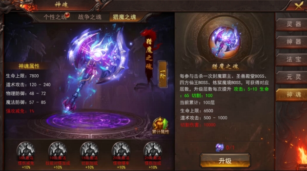 打怪加成:猎魔之魂的升阶能为玩家带来怪伤减免、对怪加成、切割加成、怪物爆率和怪伤加成等属性,这些属性在打怪过程中非常有用,能够显著提升打怪效率。