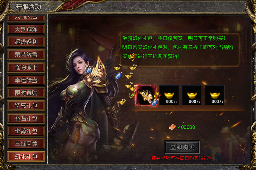 在白蛇传奇游戏中可以通过坐骑活动入手坐骑幻化礼包获取,入手坐骑幻化礼包时,可先入手三折卡即可三折获取坐骑皮肤云梦仙骥!