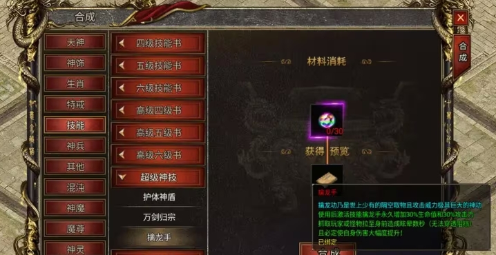 合成技能书:收集足够的至尊宝石后,可以合成擒龙手技能书。