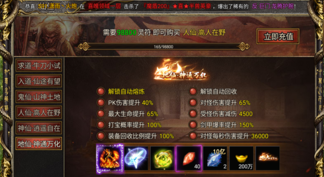 开区 4-7 天:火云洞 / 金兜洞为主,合成 9 转神装,解锁大道乾坤系统。