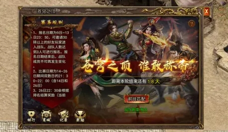 苍穹之巅活动在服务器开服76天后解锁。玩家需要与另外两名队友组队参与,匹配是根据队伍的总战力进行排名的。每个战区有30支队伍,匹配仅在同一个战区内进行。