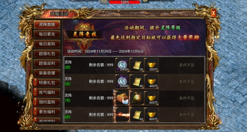 在这些阶段,玩家将解锁价值648元的灵阵礼包。这些礼包必须在当前页面直接购买,而不是通过累计充值达到相应金额后领取。因此,玩家需要在达到上述条件时,及时购买对应的灵阵礼包,以避免错过提升战力的机会。