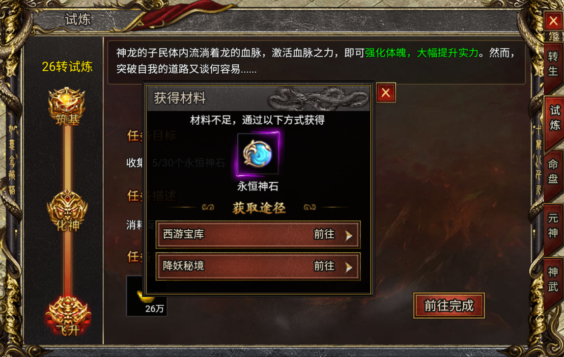4.转生材料:20转以内的转生材料都可通过刷BOSS获得,12-15转转生材料去打龙城BOSS;16-18转转生材料直接在260级以上地图挂机就可以,这边小编建议女儿国;19-20转转生材料直接在第三大陆地图刷就可以了。20转以上就需要永恒神石转生,可通过西游宝库和降妖秘境获取。
