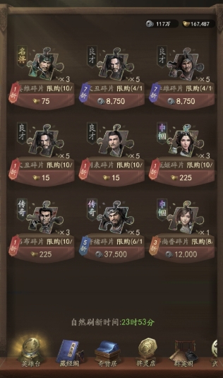 将灵店每日有四次免费刷新机会,玩家应充分利用这些机会获取所需英雄碎片。遇到孙策(反击)、甄姬(激励)、黄月英(运筹)等英雄时,务必优先获取。此外,能分解出英雄技能碎片的英雄(如吕布、姜维、郭嘉、孙尚香、赵云、关羽)也应优先考虑。如果前期书院等级较低,分解英雄碎片获得的将灵数量不足,可以通过分解良才英雄来补充。随着书院等级提升,分解高级英雄获得的将灵数量增加后,就可以减少对良才英雄的依赖。