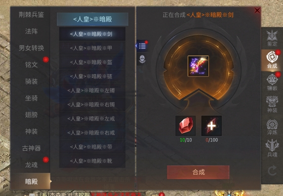 在合成-暗殿装备处可合成更高级暗殿装备;