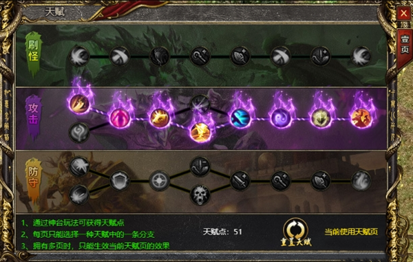 天赋系统可以拥有多页天赋,分为刷怪、攻击、防守三种分支。每页只能选择一种分支,玩家可以根据自己的需求进行天赋点的分配。