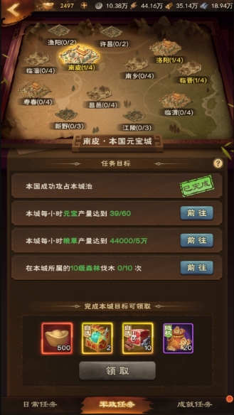 重点建设内容:优先建设军政任务和元宝城(关隘、民居、仓库、集市、翁城、宝库等)。军政任务奖励丰富,包括元宝、金色宝物箱子、宝石等。