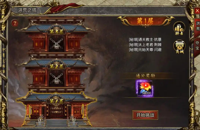 1、洪荒之塔为单人玩法,需要在限定时间内击杀本层所有BOSS,通关后可获得[不死灵花]。洪荒之塔存在多种特性BOSS,需要对应属性达标方可顺利击败.可使用参与洪荒之塔获得的不死灵花兑换洪荒嗜血令,在洪荒夺宝中抽取武将快速提升。