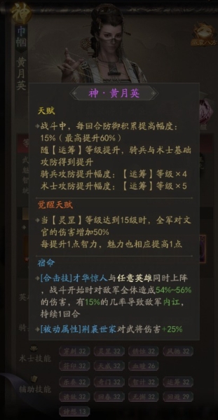 黄月英的觉醒属性对文官有额外的伤害加成,使其成为文官内战的杀手。除了司马懿外,黄月英在面对其他文官时都有显著的优势。同时,她在对抗武将时也表现出色。