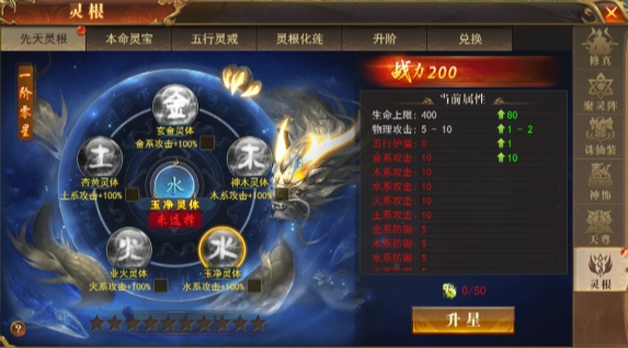先天灵根:激活先天灵根可增加100%对应五行攻击。