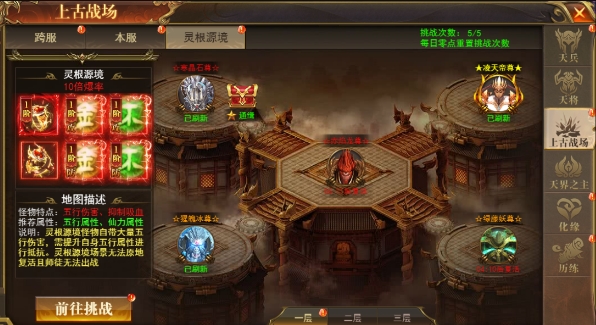 场域特点:灵根源境乃五行交融之地,场景内无法原地复活且师徒无法出战。