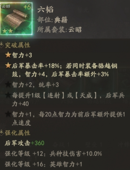 铜鼓和六韬4星:接下来将云昭书和云昭鼓升到4星,解锁全部云昭效果。