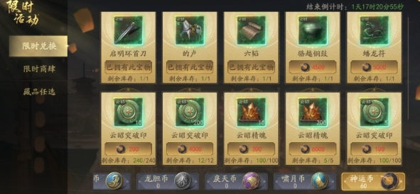 云昭令需要在神运商店中用5000神运币单独换取。如果不是拥有30万元宝以上的玩家,不建议优先换取云昭令。因为前四件宝物满星大约需要26万元宝,而云昭令满星还需要额外的12万元宝。至少需要强化到3星才能获得百分比免疫效果。