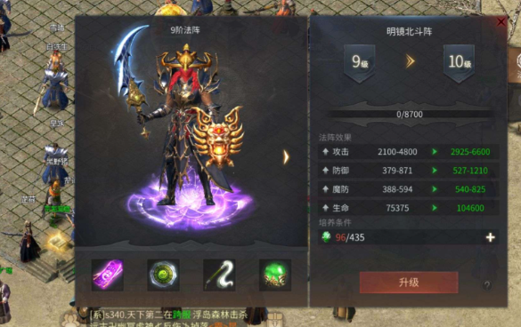 法阵系统升级后攻击、魔法、道术加成是最高的,升级法阵可以更快与同级别的玩家拉开差距。交易行每天都会固定刷新一批法阵碎片,建议每日购买30钻以下的碎片。其他的碎片就通过每日的礼包或者活动特惠礼包以及终身限购礼包获取。