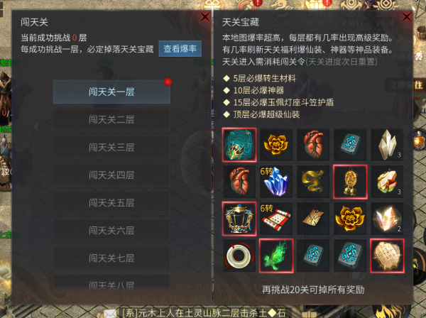 勇闯天关是《傲世龙城》中一个重要的资源获取玩法,位于盟重土城(97,86)。天关共有20层,每过一层即可获得一件珍贵宝物。其中,第5层可得转生材料,第10层有神器,第15层是玉佩灯座,顶层则可获得超级仙装。天关内的宝藏每日更新,奖励不断变化。