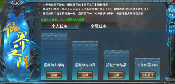 开服满60天后,玩家会激活仙界之门的任务。完成任务后,即可进入仙界。