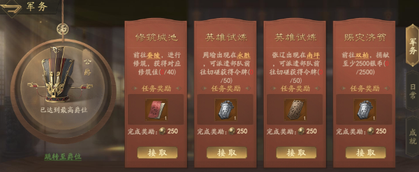 军务是提升爵位等级的关键任务,爵位等级直接影响府邸等级,进而影响英雄等级和技能学习。因此,军务任务非常重要,建议每天优先完成。