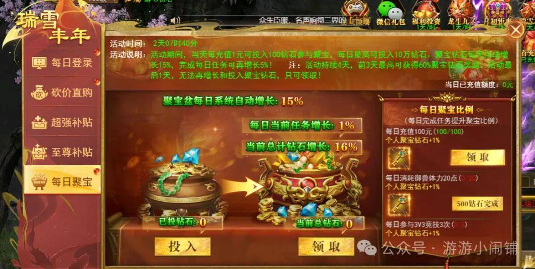 开天西游每日聚宝活动期间,当天每充值1元可投入100钻石参与聚宝,每日最高可投入10万钻石。聚宝钻石每长15%,完成每日任务可再增长5%!