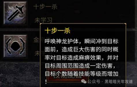 十步一杀:召唤神龙护体,瞬间冲到目标脸上造成巨量伤害,并概率麻痹目标及周围敌人。