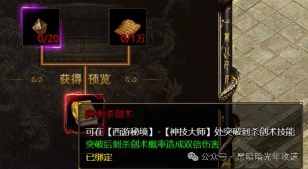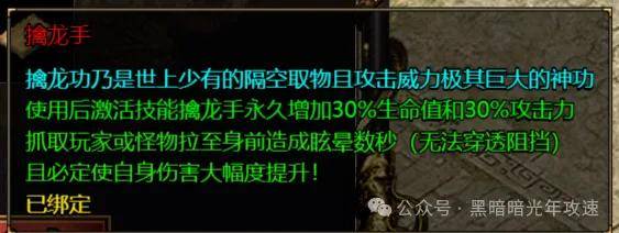 擒龙手:激活永久加30%生命和30%攻击,主动使用能将一个目标(玩家或怪物)抓到面前并眩晕数秒,同时大幅提升自身伤害。集先手控制、爆发增益于一身,PK神技。