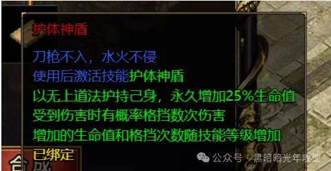 护体神盾:激活后永久加25%生命,受到攻击时有概率直接格挡数次伤害。血量越高,格挡越强。
