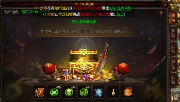仙运盗贼是四圣封神中后期白嫖核心玩法,门槛开服满80天+跨服战盟成员。机制简单:白天杀夺仙战场仙兽攒线索,线索全跨服共享,数量越多当晚22:00刷新的盗宝贼越多,击杀掉绑定/非绑定红包、高阶心法书、强化材料、仙装碎片。