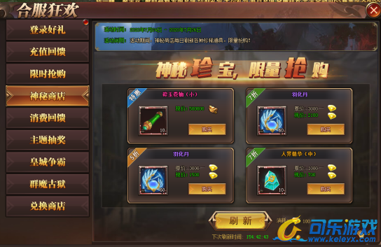 活动内容:活动期间,神秘商店会刷新各种珍稀道具,限量抢购。商店每隔一段时间会自动刷新,玩家可消耗金钻或刷新令进行手动刷新。